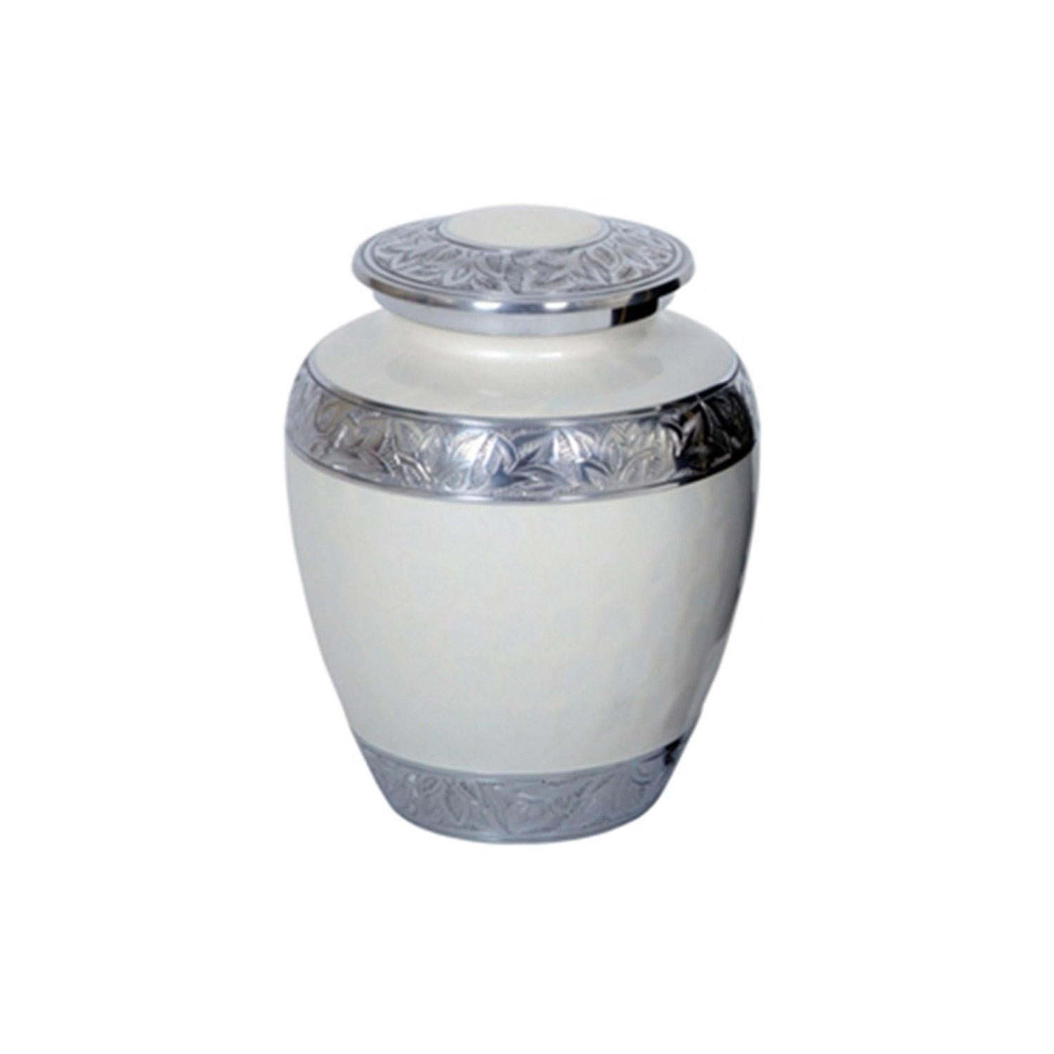 This beautifully crafted adult cremation urn is made of high-quality aluminum, designed to provide a dignified and lasting memorial for your loved one. The urn features an elegant white finish, complemented by intricately engraved leaf band detailing in silver, symbolizing peace and remembrance.