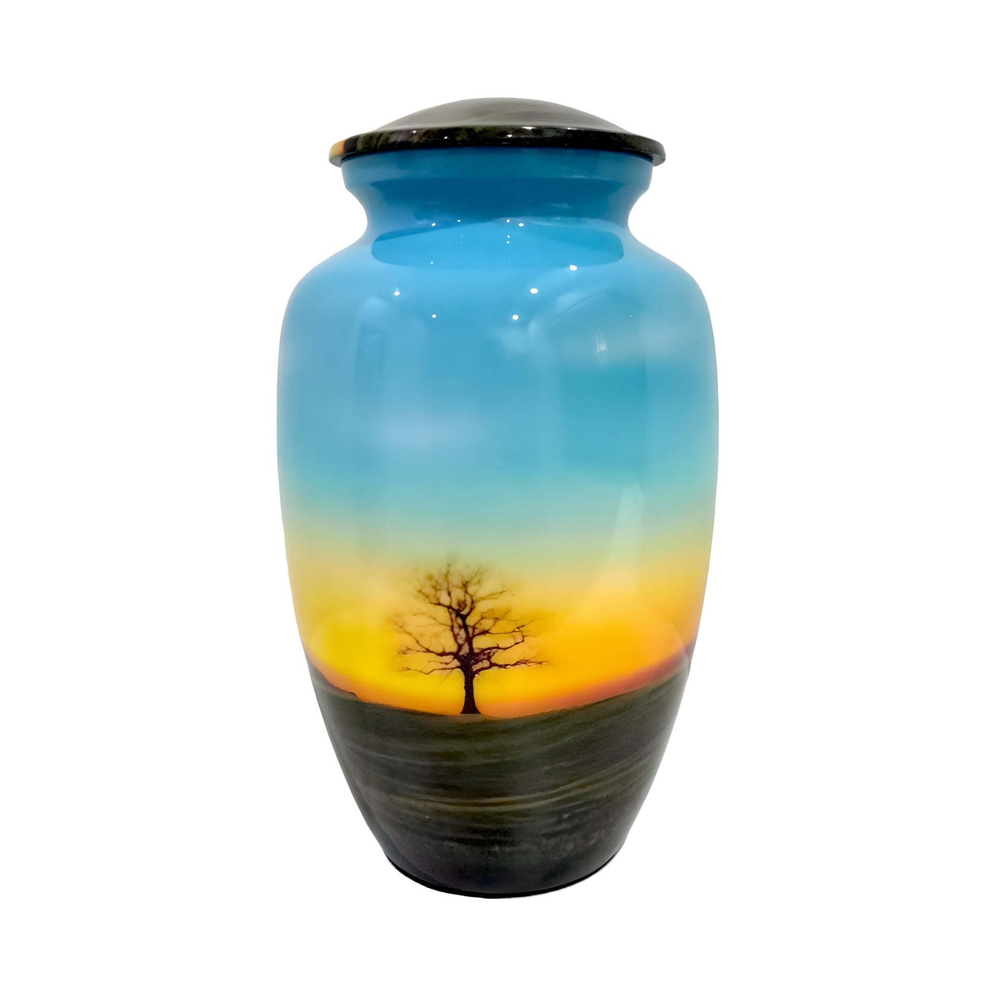 The Tranquil Sunset Cremation Urn offers a peaceful and timeless tribute to your loved one. Featuring a stunning design of a lone tree set against a serene sunset sky in shades of blue, gold, and orange, this urn symbolizes strength, remembrance, and eternal peace. The artwork evokes a sense of calm and reflection, making it a meaningful resting place for cherished memories.